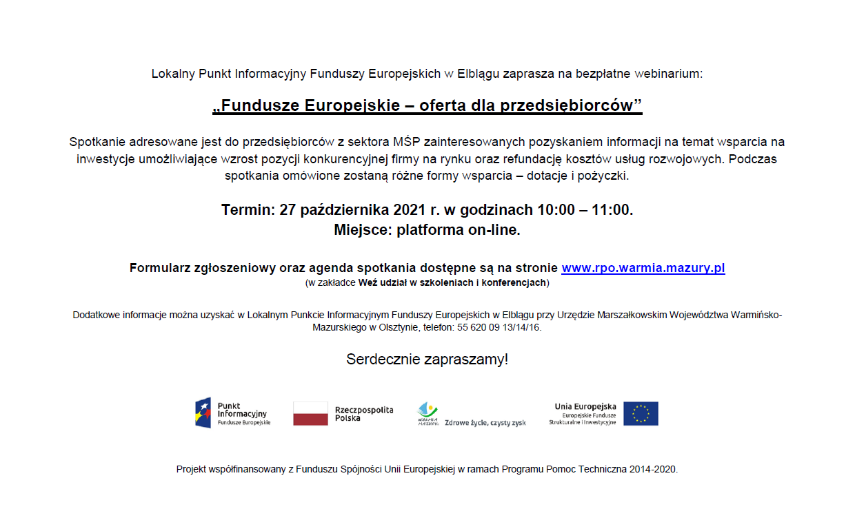 Uprzejmie zapraszamy do udziału w bezpłatnym webinarium „Fundusze Europejskie – oferta dla przedsiębiorców” organizowanym przez Lokalny Punkt Informacyjny Funduszy Europejskich w Elblągu.