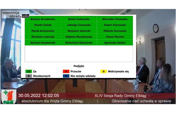 Rada Gminy Elbląg jednogłośnie udzieliła Wójtowi Gminy wotum zaufania oraz absolutorium.