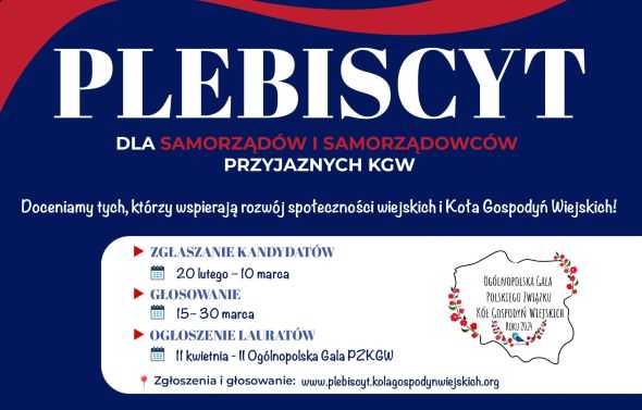 Polski Związek Kół Gospodyń Wiejskich po raz drugi ogłasza Ogólnopolski Plebiscyt „Samorząd Przyjazny KGW”, mający na celu wyróżnienie jednostek samorządu terytorialnego oraz samorządowców, którzy aktywnie wspierają lokalne Koła Gospodyń Wiejskich. To wyjątkowa okazja, by docenić ich