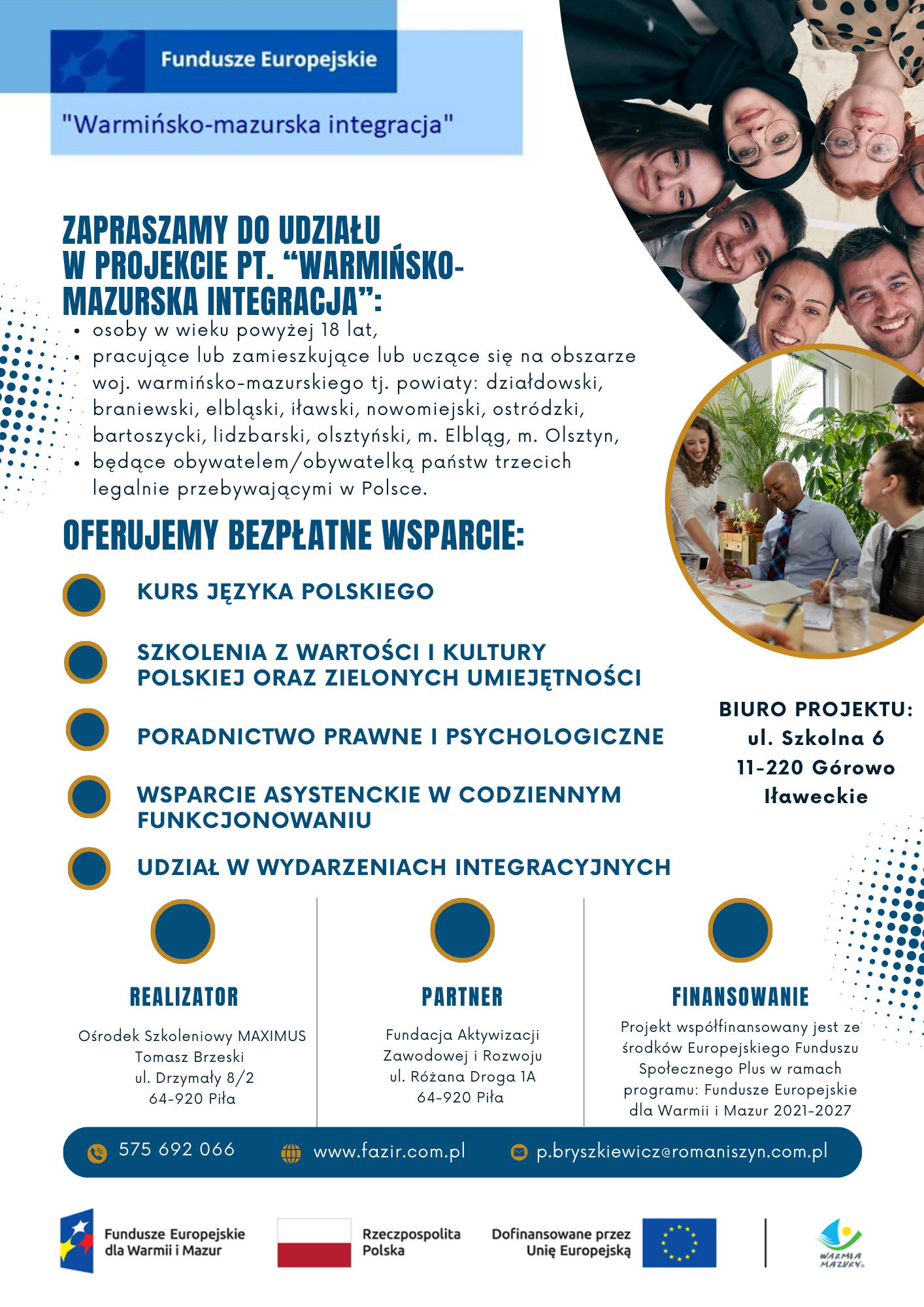Ośrodek Szkoleniowy MAXIMUS Tomasz Brzeski w partnerstwie z Fundacją Aktywizacji Zawodowej i Rozwoju zapraszają do udziału w projekcie pn. „Warmińsko-mazurska integracja”, nr FEWM.09.03-IZ.00-0067/23 realizowanym na obszarze woj. warmińsko-mazurskiego (powiaty: braniewski, elbląski, ostródzki, iławski, nowomiejski, działdowski, bartoszycki, lidzbarski, olsztyński, m. Elbląg, m. Olsztyn).