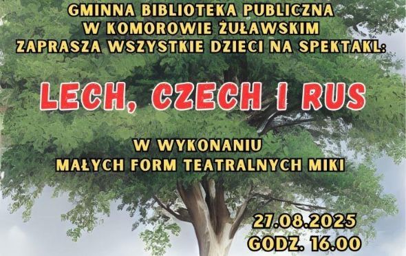 Gminna Biblioteka Publiczna w Komorowie Żuławskim zaprasza wszystkie dzieci wraz z rodzicami na spektakl teatralny pt. "Lech, Czech i Rus" w wykonaniu Małych Form Teatralnych "MIKI" z Krakowa. Spektakl odbędzie się 27 sierpnia 2025 r. (środa) o godz. 16.00 w czytelni Biblioteki w Komorowie Żuławskim. Serdecznie zapraszamy!