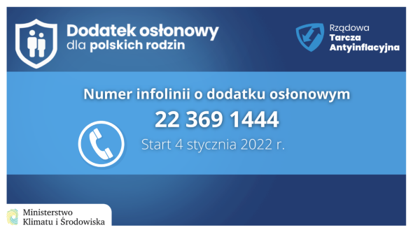 Ministerstwo Klimatu i Środowiska poinformowało, że od wtorku 04.01.2022 r. zostanie uruchomiona specjalna infolinia na temat dodatku osłonowego. Będzie ona działała od poniedziałku do piątku w godzinach 8-16 pod numerem telefonu +48223691444.