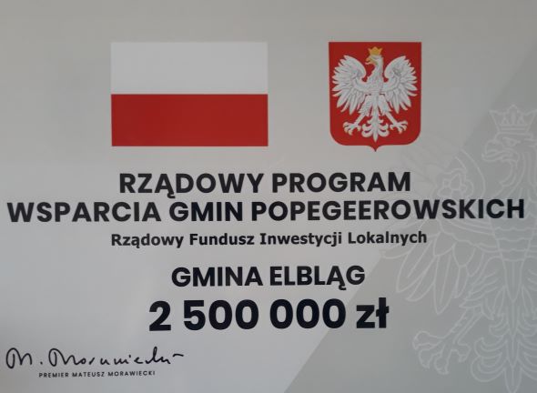 Wójt Gminy Elblag w dniu 17 czerwca 2021 r. odebrał z rąk Wojewody Warmińsko – Mazurskiego promesę w ramach Rządowego Programu Wsparcia Gmin Popegeerowskich na kwotę 2.500.000 zł .