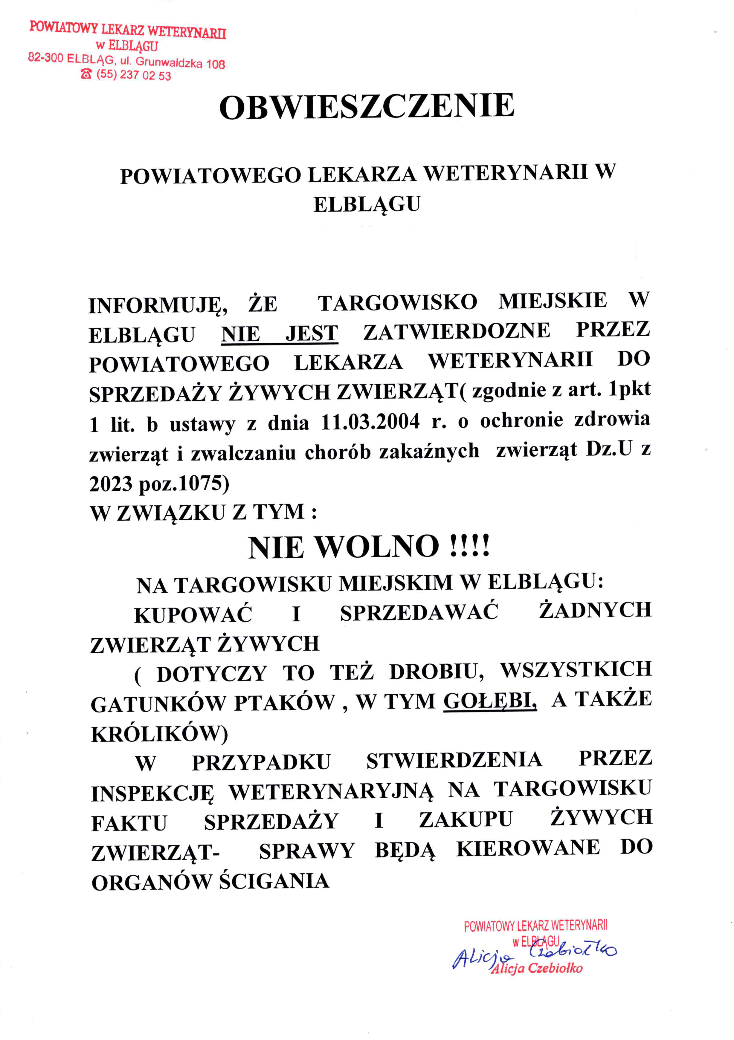 Obwieszczenie Powiatowego lekarza Weterynarii w Elblągu dotyczące drobiu